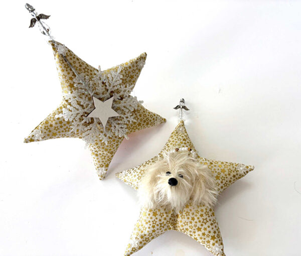 Made from high-quality materials, German Mohair, glass eyes, and an embroidered nose. The pup dons a faux pearl and bead halo. Each point of the star ends with a flower with a pearl center. The back of the ornament has a glittered white snowflake with a wooden star that can be personalized by writing a name.