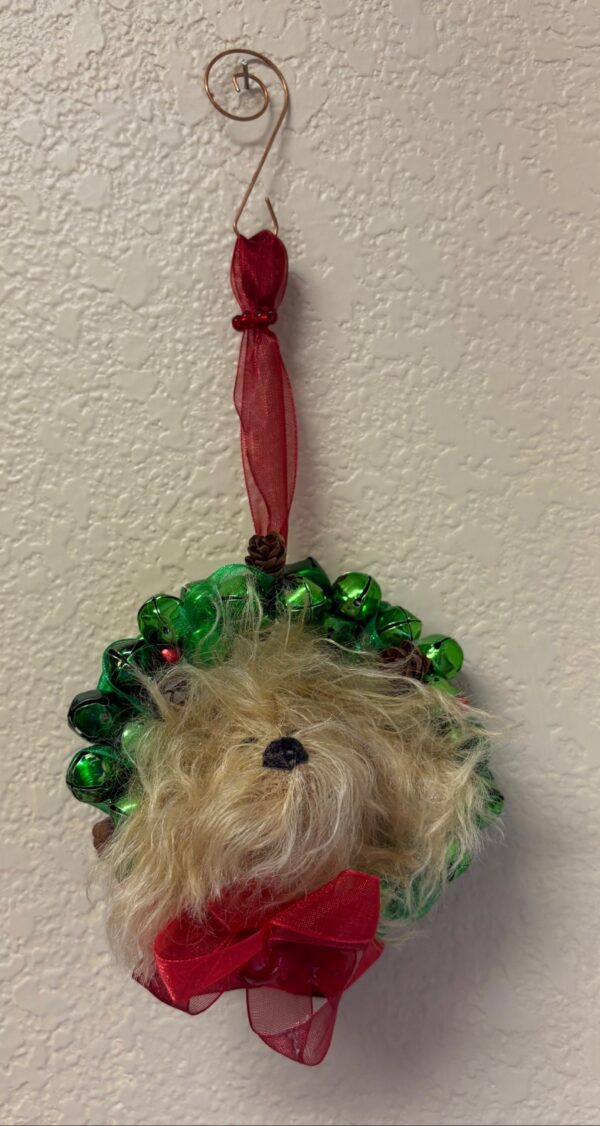 Green jingle bells surround each mohair Havanese face. Colorful ribbons, bells, and baubles complete the festive look.
