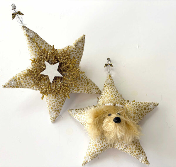 Made from high-quality materials, German Mohair, glass eyes, and an embroidered nose. The pup dons a faux pearl and bead halo. Each point of the star ends with a flower with a pearl center. The back of the ornament has a glittered gold snowflake with a wooden star that can be personalized by writing a name.