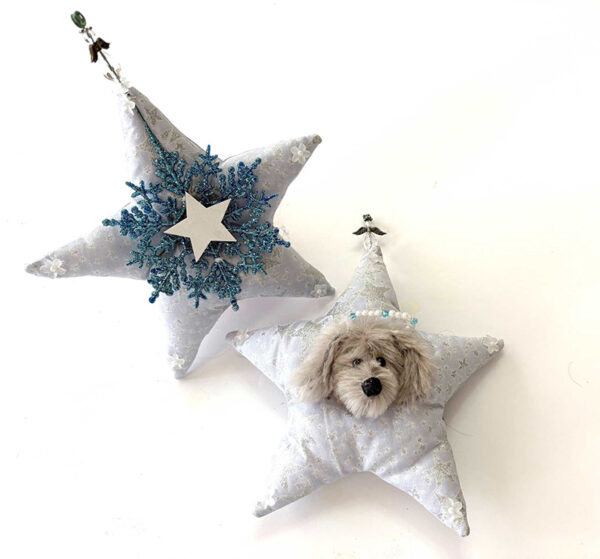 Made from high-quality materials, German Mohair, glass eyes, and an embroidered nose. The pup dons a faux pearl and bead halo. Each point of the star ends with a flower with a pearl center. The back of the ornament has a glittered aqua snowflake with a wooden star that can be personalized by writing a name.