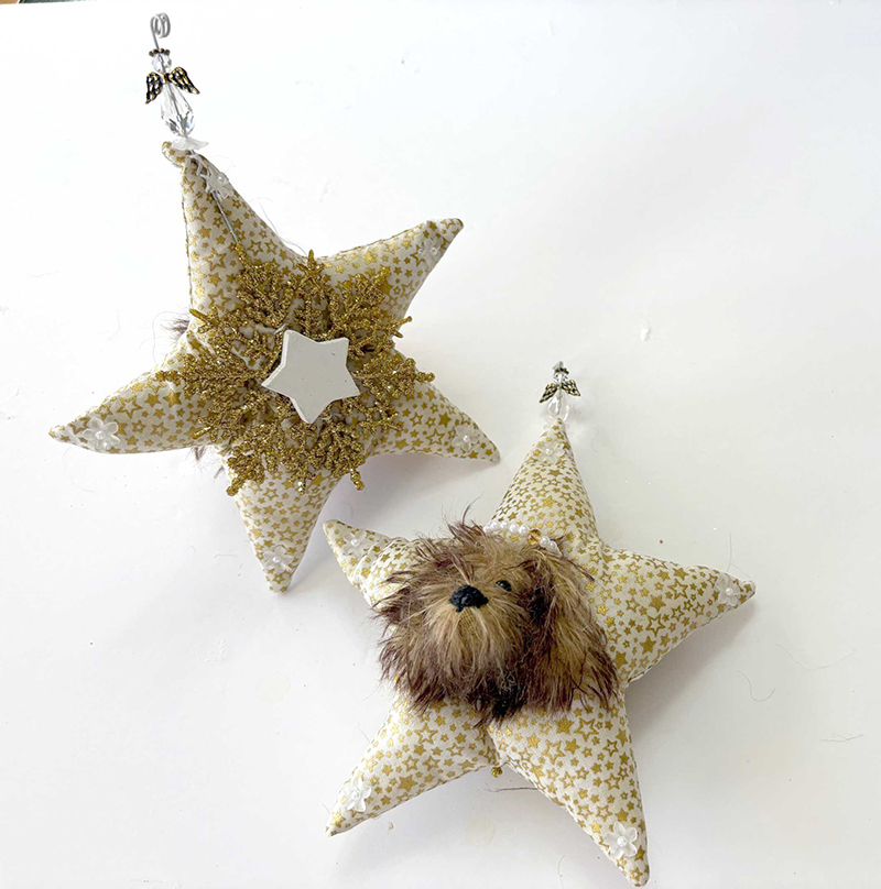 Made from high-quality materials, German Mohair, glass eyes, and an embroidered nose. The pup dons a faux pearl and bead halo. Each point of the star ends with a flower with a pearl center. The back of the ornament has a glittered gold snowflake with a wooden star that can be personalized by writing a name.