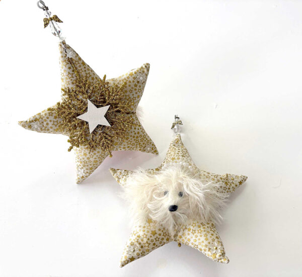 Made from high-quality materials, German Mohair, glass eyes, and an embroidered nose. The pup dons a faux pearl and bead halo. Each point of the star ends with a flower with a pearl center. The back of the ornament has a glittered gold snowflake with a wooden star that can be personalized by writing a name.